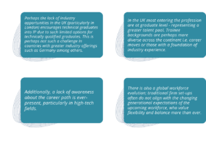 Confounding these challenges are the interesting geographical disparities between the UK and other European countries. UK firms report hundreds of applications for trainee roles each year, while firms in Germany, the Netherlands, Norway and many other regions struggle to attract candidates.